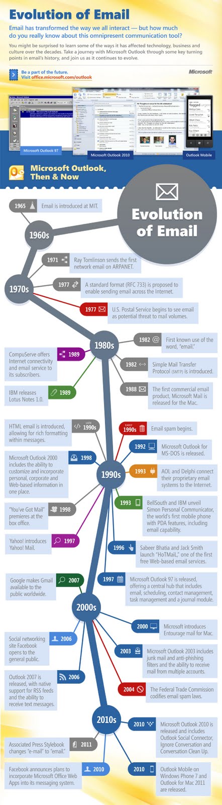 Infographic is best way to know about anything as it contains detail history from beginning. We have recently cover the infographic on A world Without Facebook and now the Evolution of Email. The inforgraphic includes the most part of evolution Microsoft’s email system from Outlook 1997 to Outlook Mobile. The service was first introduced in 1965.