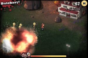 In Zombies &- Me you are trying to keep your Grandmother’s house safe from the attacking zombie horde. To do this you’re running around outside the house acting like live bait trying to keep them from going after the house. You’re also trying to lead them underneath bombs that are dropping (without getting caught in the blast yourself).
