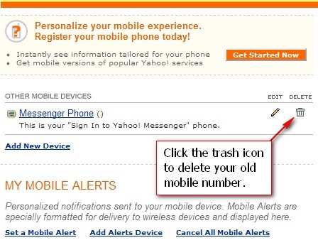 when the page is loaded, click the trash icon to delete your old mobile number…
