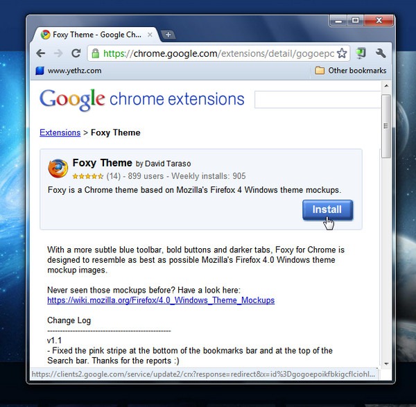 Foxy is a Chrome theme based on Mozilla’s Firefox 4 Windows theme mockups.