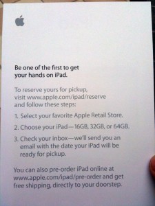 On this card you will find instructions on how to reserve the tablet for pickup. The card states that first of all you should visit apple.com/ipad/reserve, then choose the store you want to pick up your iPad from, after this you should choose your iPad model i.e. 16, 32, 64 GB. Apple will send you “an email with the date iPad will be ready for pickup” not saying the gadget will be ready on April 3. The card also references free shipping for iPad pre-orders, which can be made online at apple.com/ipad/pre-order.