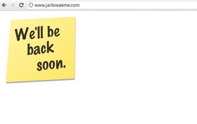 JailbreakMe.com changed with the sticky note that says Well be back soon