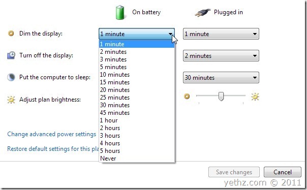 now after click change plan settings you are now in Edit plan settings configuration window, from here you can adjust the dim display time how many minutes you want to dim your display for a period of inactivity, in battery mode or in plugged in mode.