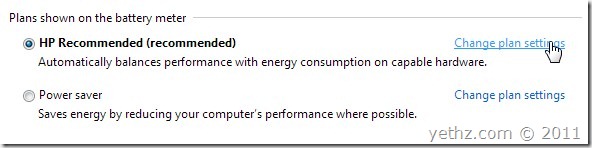from the dialogue window, click change plan settings on your current power plan, in our example we are using HP recommended plan.